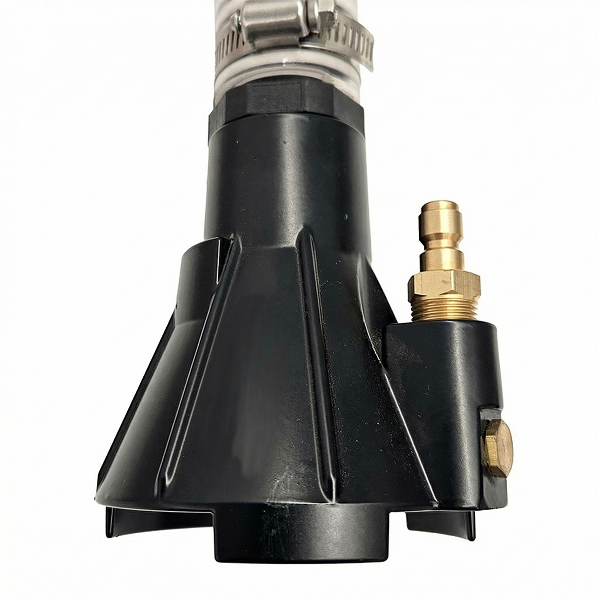 The base unit attaches to the end of a pressure washer lance with a quick coupler for extension to the bottom of the pit. Uses a 0° tip for suction / power ejection. Plus it’s easy to change for different pluming system flows and pressures.