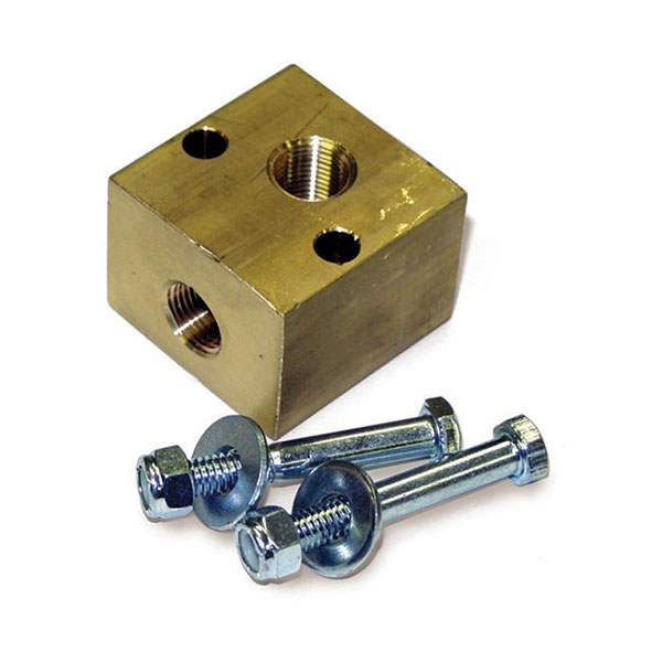 This 3/8″ x 3/8″ AP Unloader Mounting block ends vibration caused fitting failure. Made from machine block brass, it includes mounting hardware.